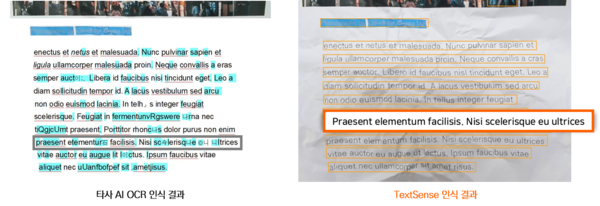 ‘텍스트센스’의 가장 큰 특징은 텍스트를 문장 단위로 인식한다는 점이다. 대부분 AI OCR 제품이 단어 단위로 데이터를 학습한 AI를 사용하는 것과 달리, ‘텍스트센스’에는 문장 단위로 데이터를 학습한 AI가 적용되어 있다. 때문에 문서 이미지에 포함된 텍스트를 단어나 개별 글자가 아닌 행 단위로 인식하고, 문장 데이터를 학습하는 과정에서 자연스럽게 익힌 문맥 파악 능력을 바탕으로 흐릿한 글자도 맥락상 자연스러운 글자로 읽어낸다.