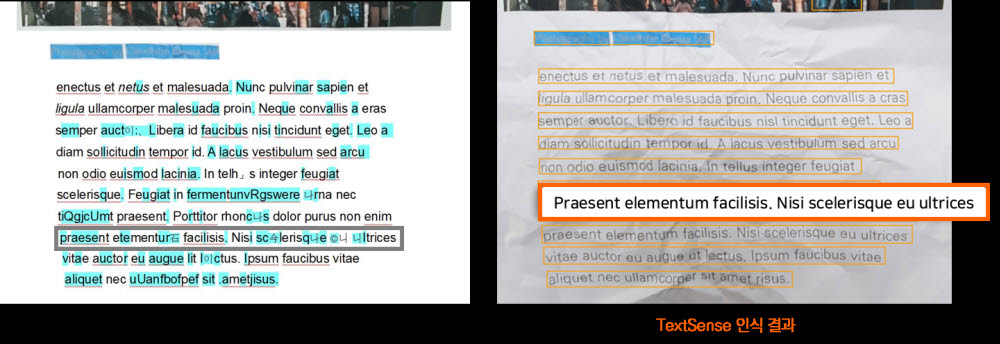 텍스트센스는 텍스트를 문장 단위로 인식하는 AI 솔루션이다. 문서 이미지에 포함된 텍스트를 단어나 개별 글자 단위가 아닌 행 단위로 인식한다. 문장 데이터를 학습하는 과정에서 자연스럽게 익힌 문맥 파악 능력을 바탕으로 흐릿한 글자도 맥락상 자연스러운 글자로 읽어낸다. 텍스트센스는 '문장 단위 데이터' 학습에 최적화된 AI를 탑재했다. 여타 AI OCR 제품은 '단어 단위 데이터' 학습 AI를 탑재했다.