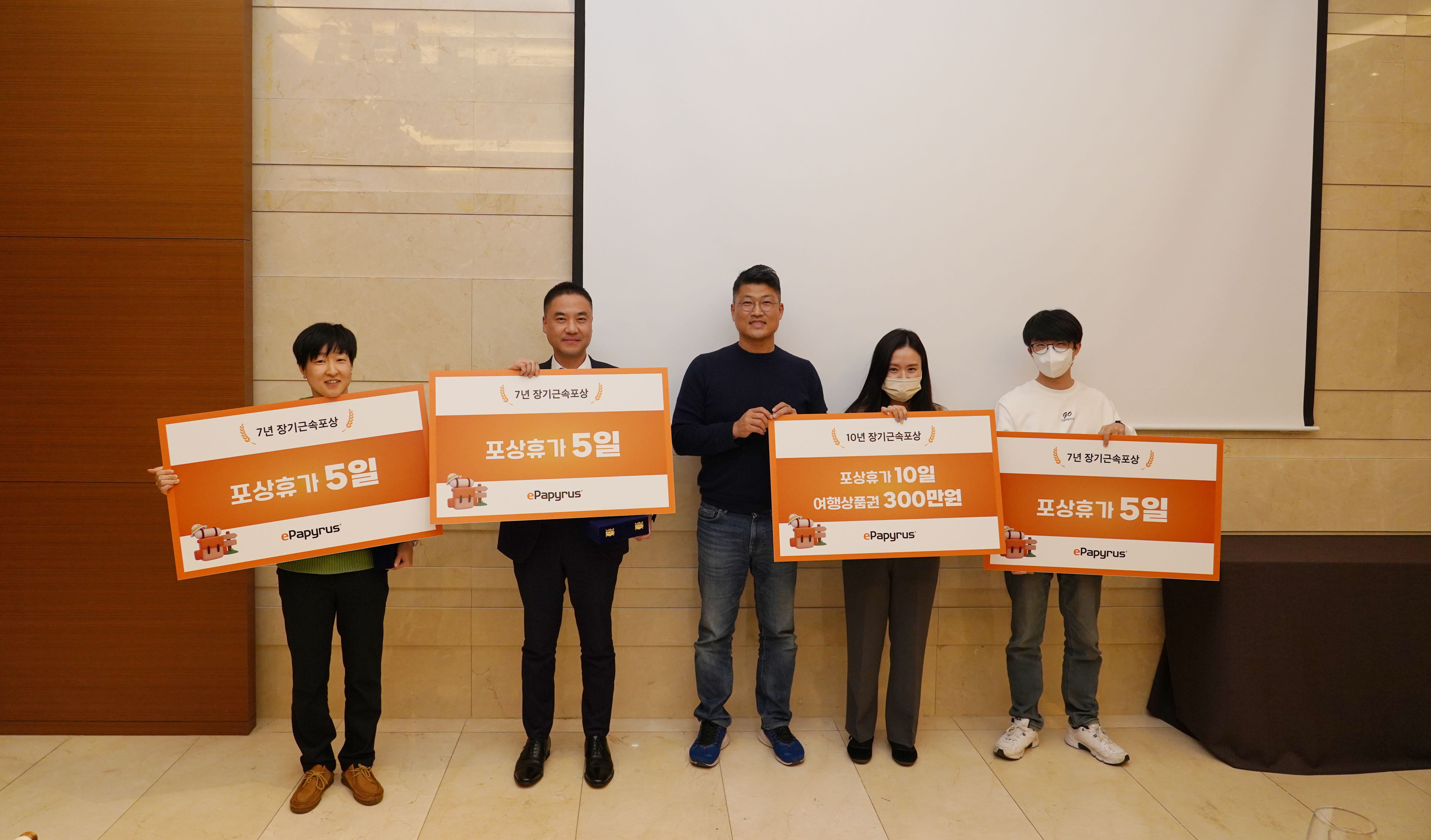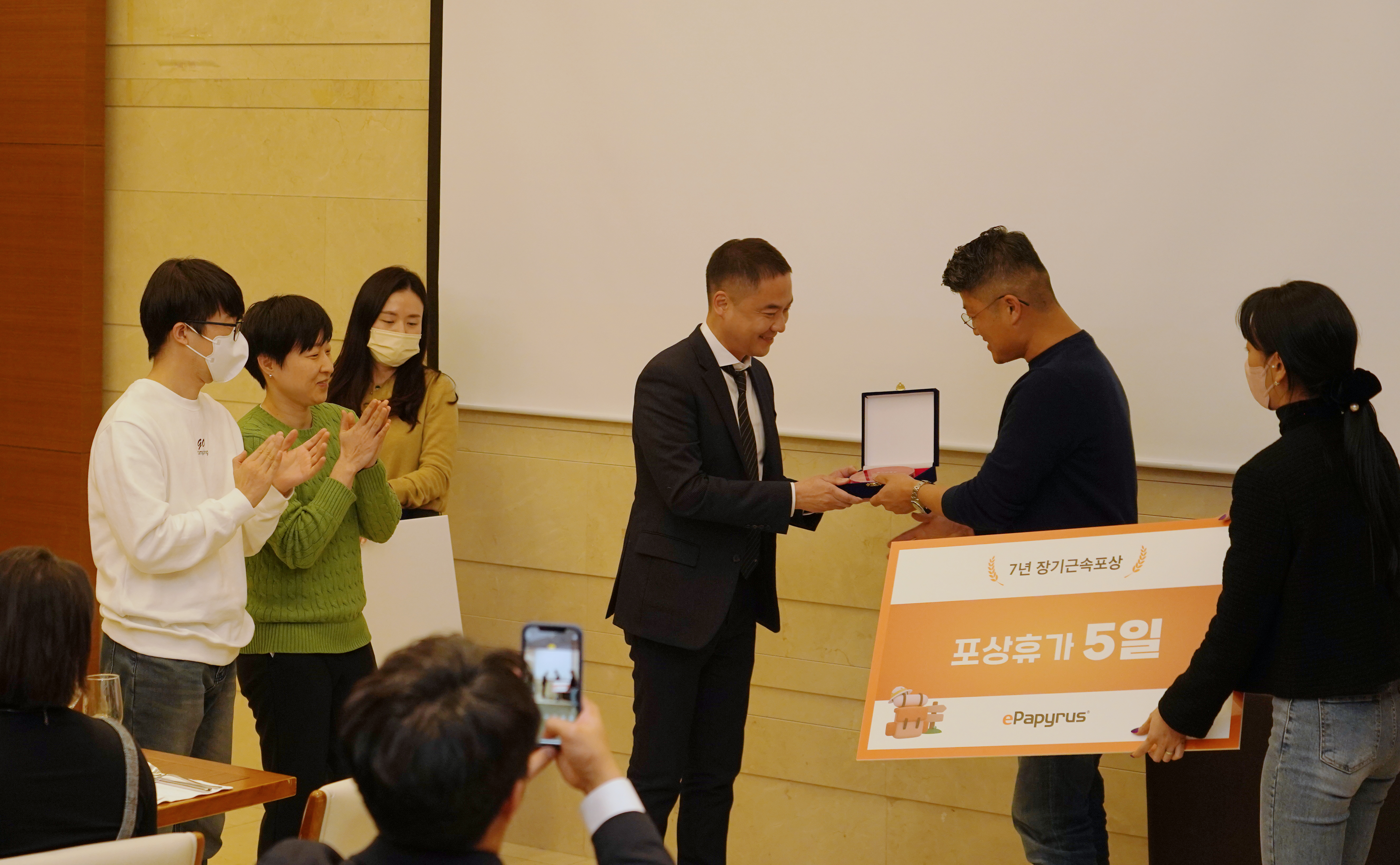 5년, 7년, 10년이나 이파피루스와 함께 해 주신 베테랑 직원들을 위한 포상 휴가와 포상금을 수여했는데요. 특히 근속 10년차에게는 포상휴가 10일에 300만원 상당의 여행상품권까지 주어져 모두의 부러움을 한 몸에 모았습니다😀