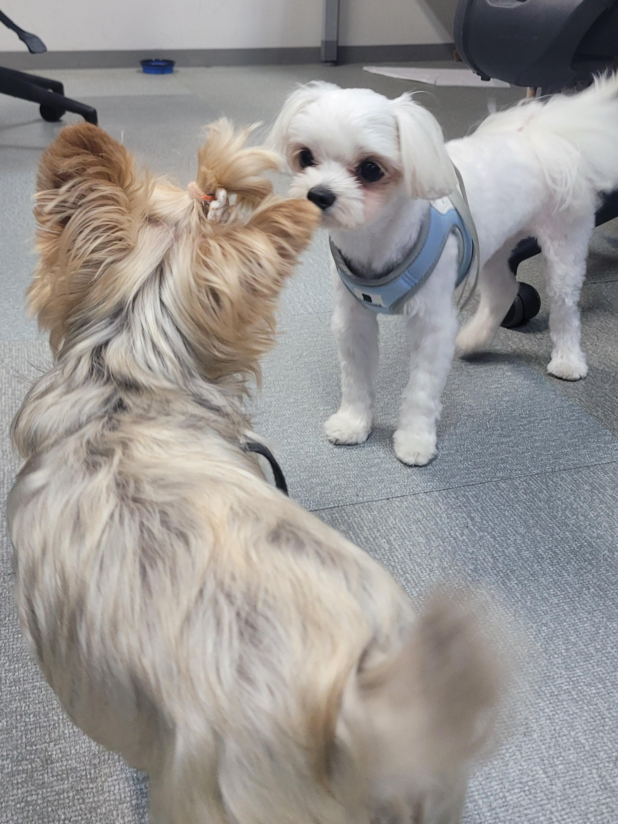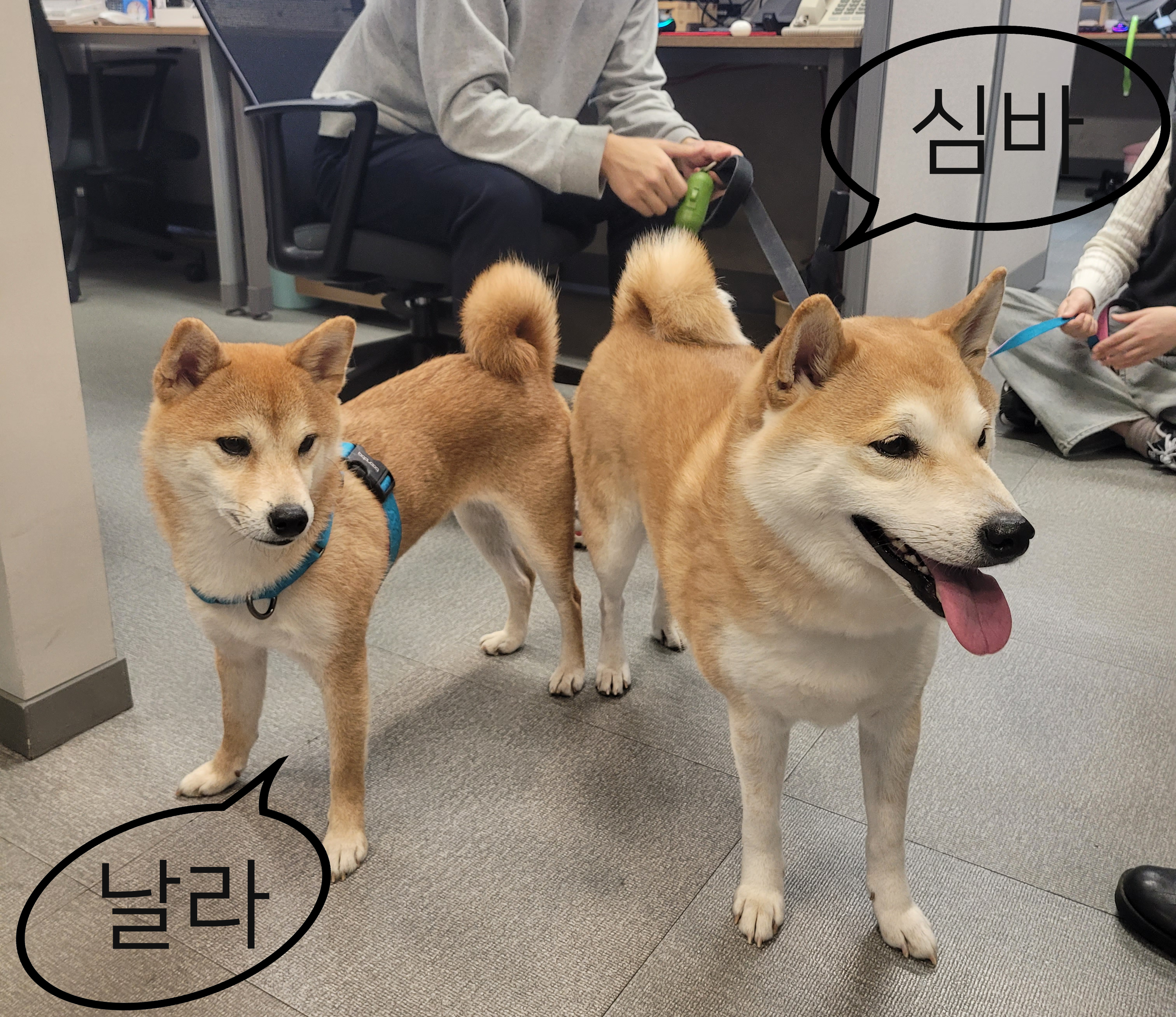주로 금요일에 출근하는 심바와 날라입니다. 개발부 선임님과 함께 출근하고 있습니다. 심바는 마이웨이 기질이 있어 혼자 있는 것을 선호하는 편이랍니다.