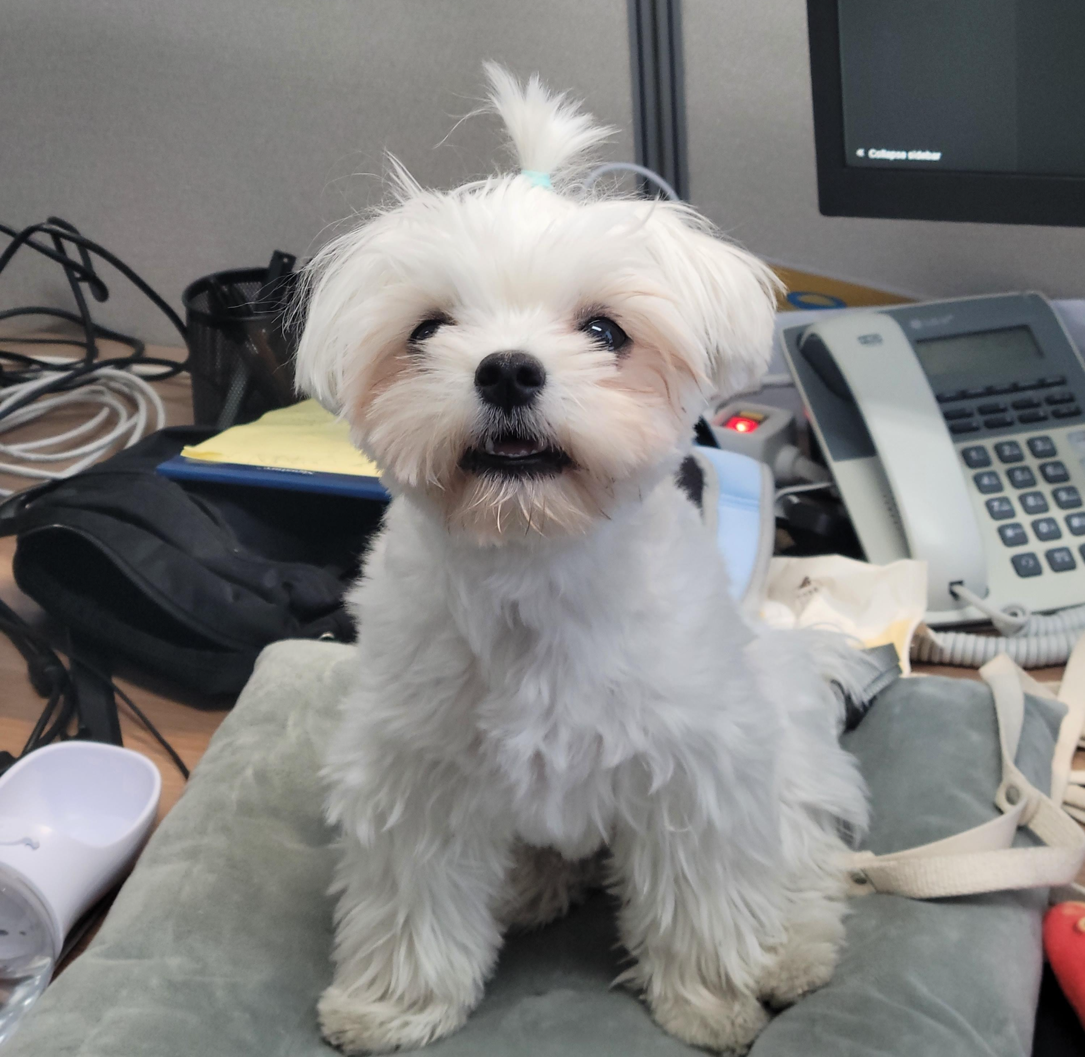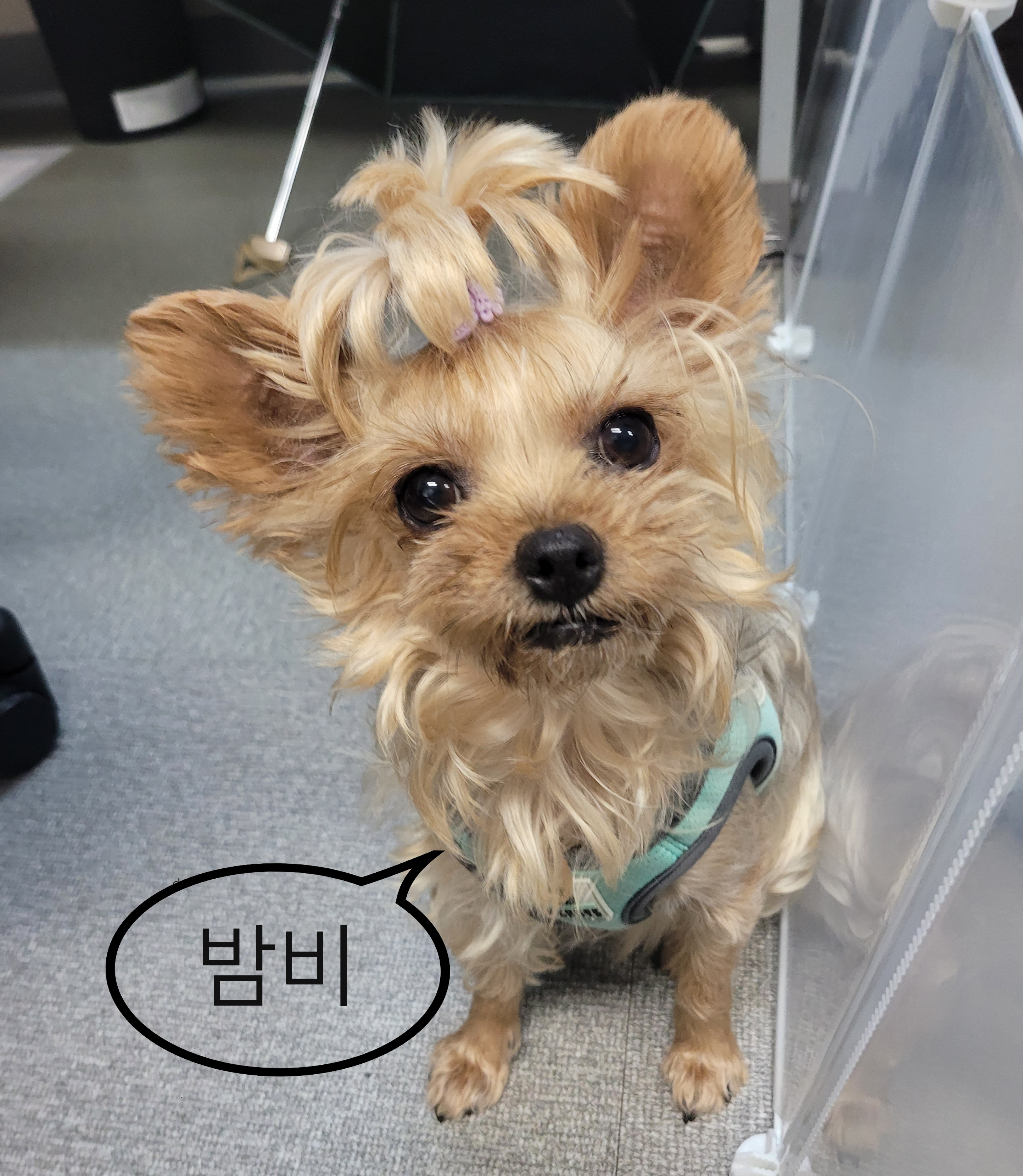 비교적 최근에 출근을 시작했지만 출석률이 높은 밤비입니다. 기술지원팀 팀장님과 함께 출근하고 있습니다. 엄청난 미모의 소유자로 머리방울이 매일 바뀌는 패셔너블댕입니다.