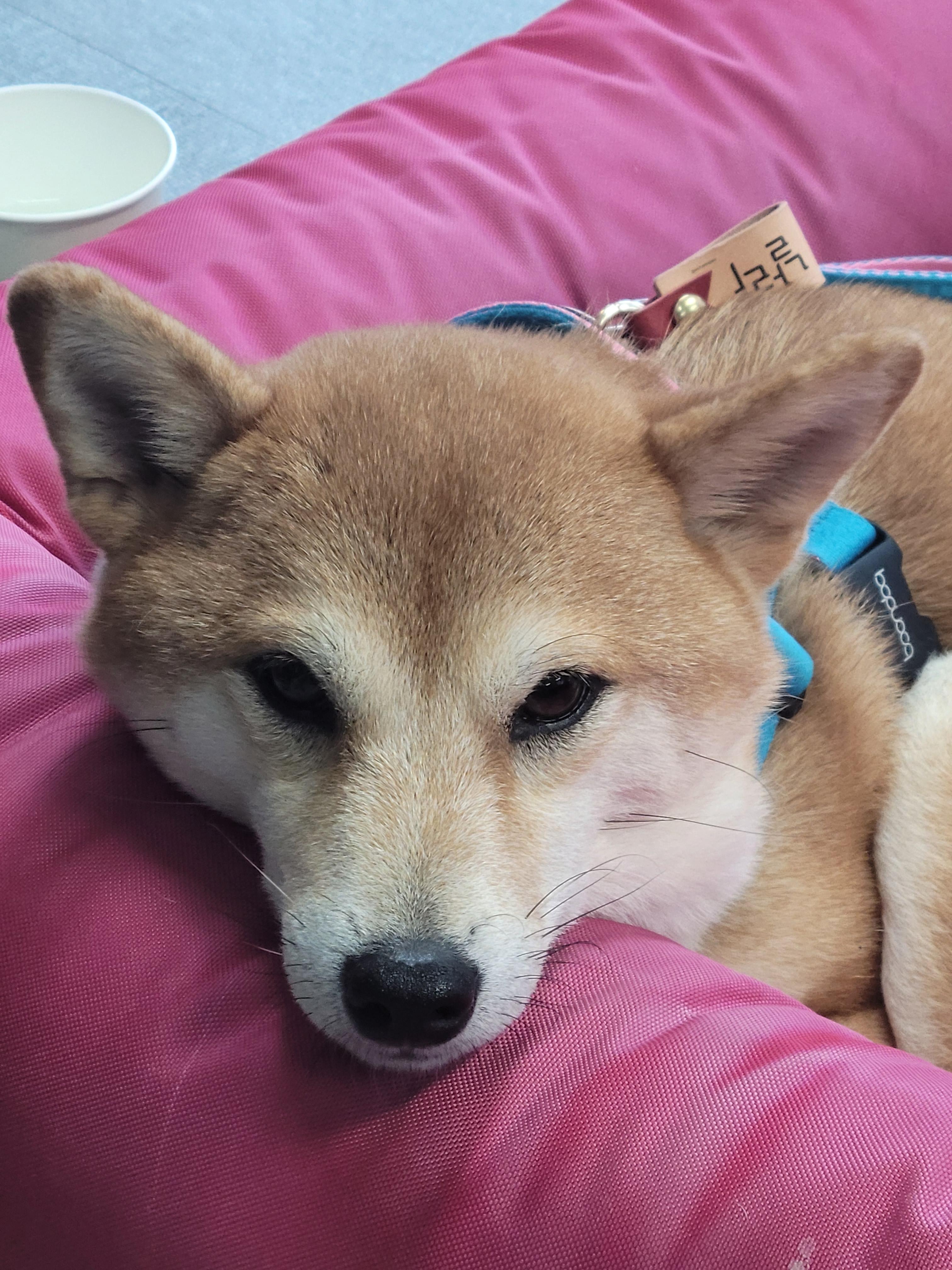 날라의 근무 모습. 대부분 쿠션 안에 들어가서 턱을 괴고 고민(?)하며 시간을 보냅니다. 너무 청초하지 않나요🥹