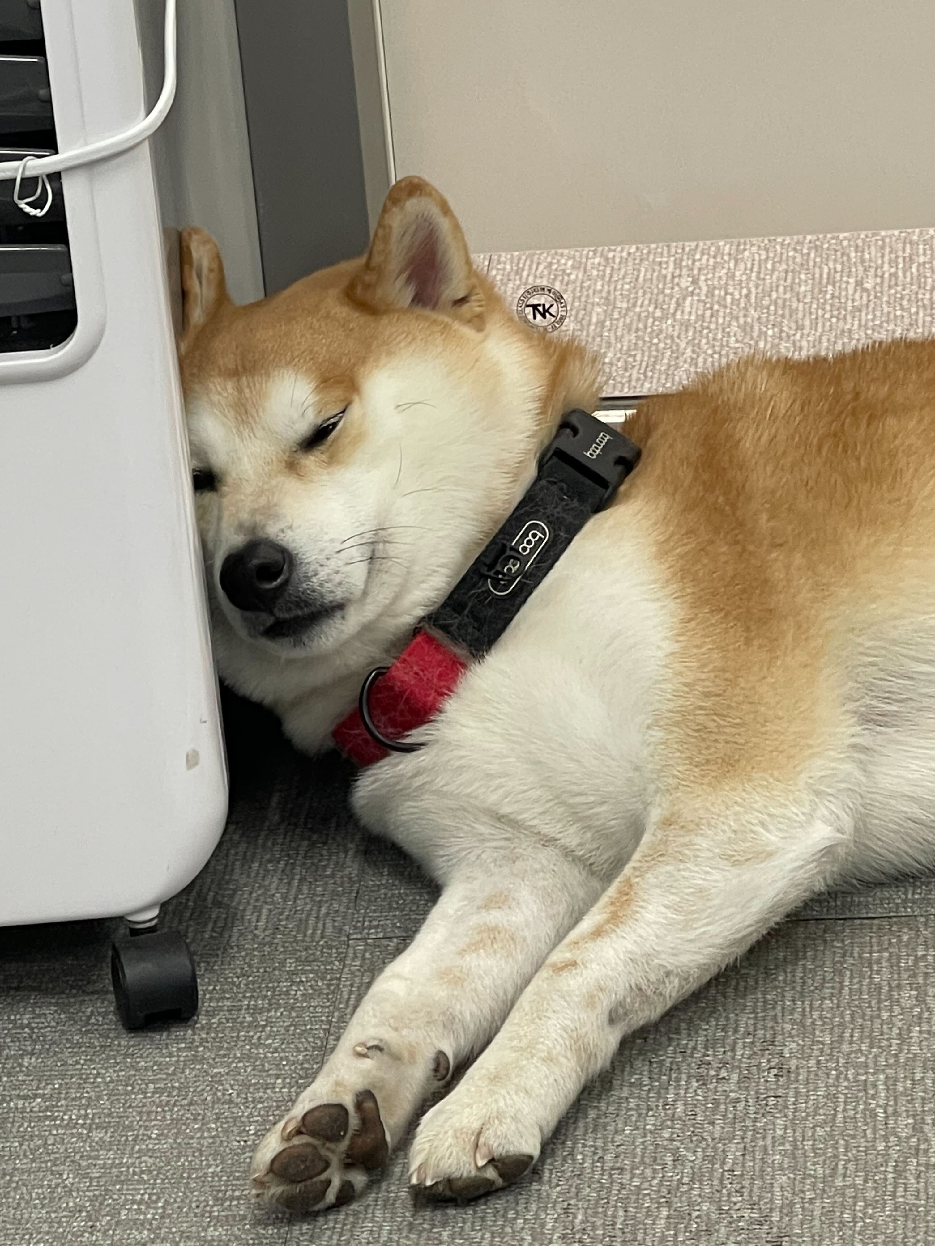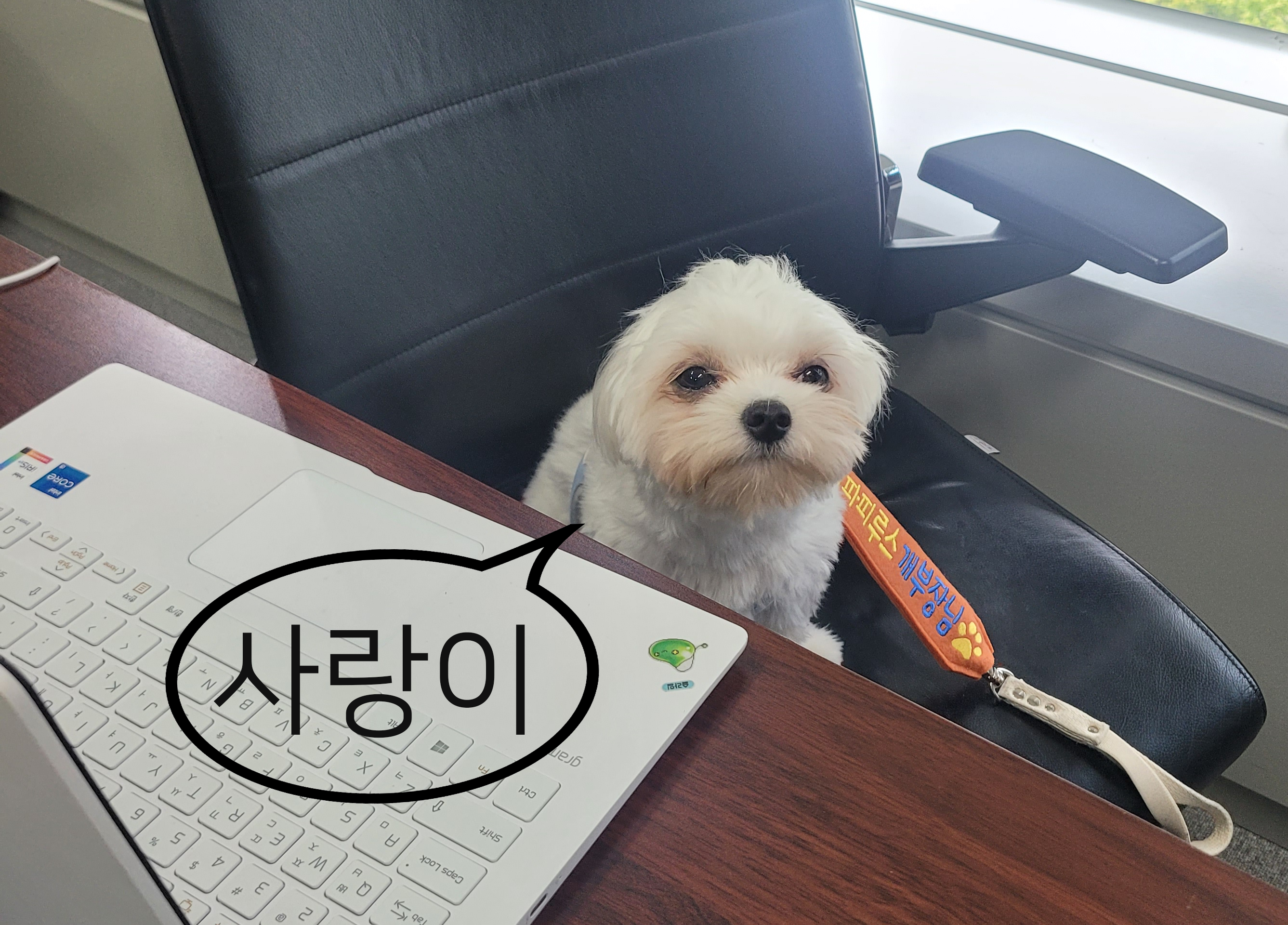 사랑이는 100일때부터 회사에 출근한 고인물 직원댕인데요, 현재 출근하는 직원댕 중 가장 근속년수가 긴 최고참입니다. 개발부 선임님과 함께 출근하고 있습니다.