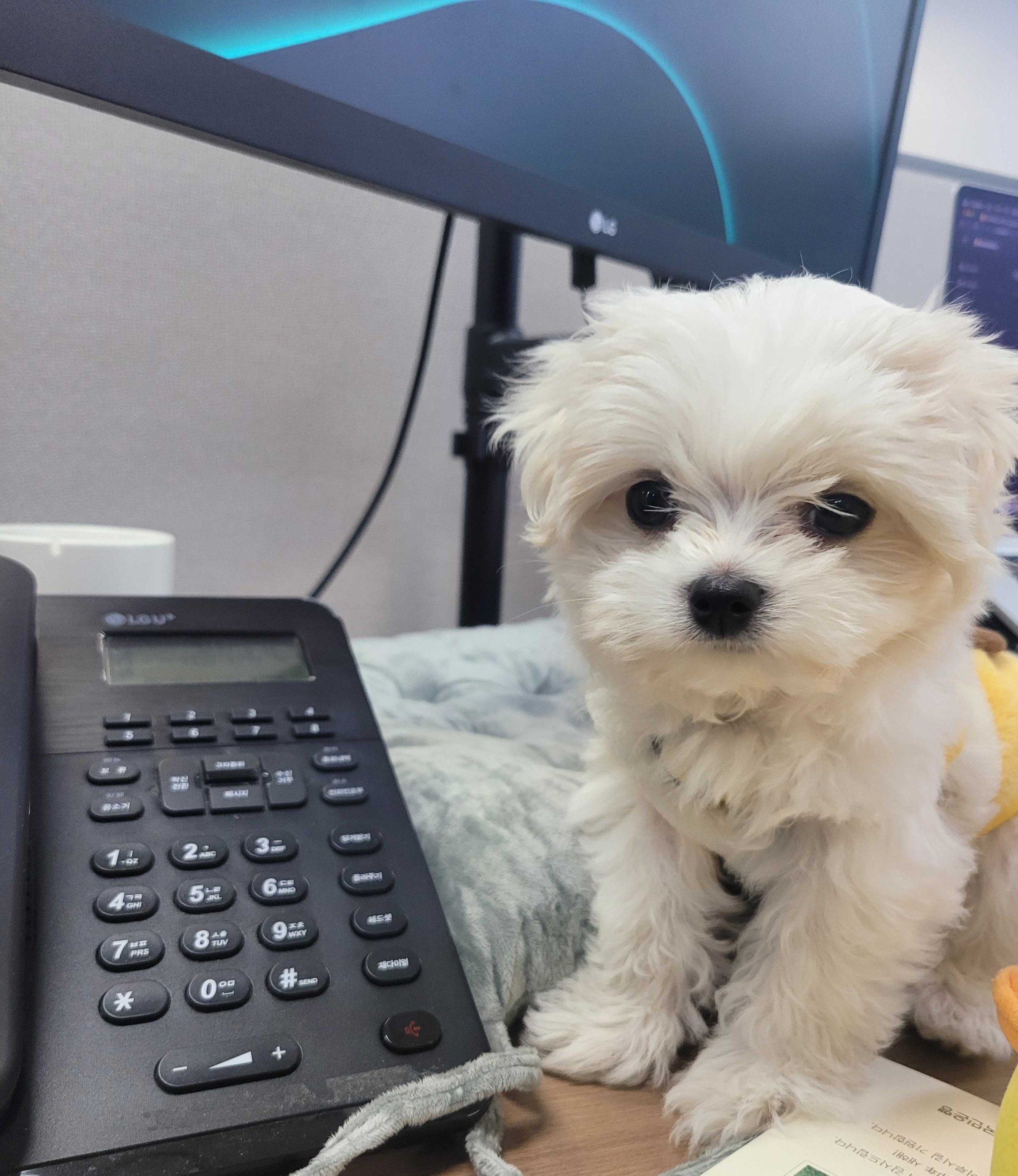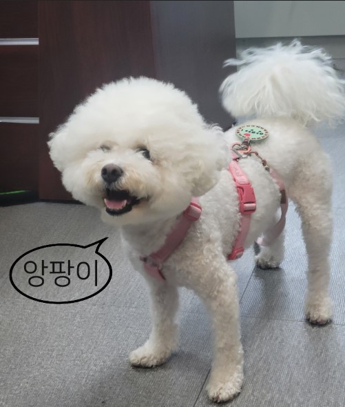 귀엽고 퐁실한 하이바가 특징인 비숑 앙팡이입니다. 부사장님과 함께 2주간 출근했는데, 그간 부사장실을 너무 열정적으로 지킨 나머지 앙팡이의 허락이 떨어져야 부사장님을 뵐 수 있었다고….
