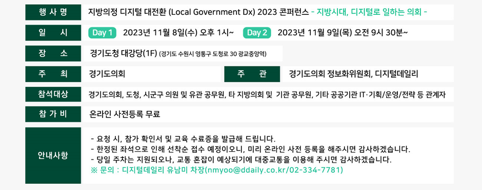 컨퍼런스는 23년 11월 8일~9일 양일에 걸쳐 경기도청 대강당에서 진행됩니다