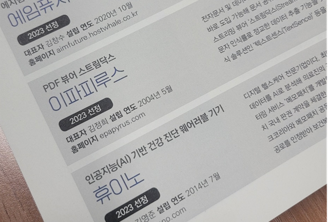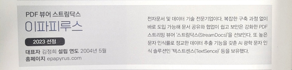 올해는 ‘생성형 인공지능’이 그 무엇보다 화제가 되었던 해이므로 이를 중심으로 기업을 선정하였다고 하는데요, 이파피루스는 ‘데이터 가공’ 부문에 선정되었습니다.