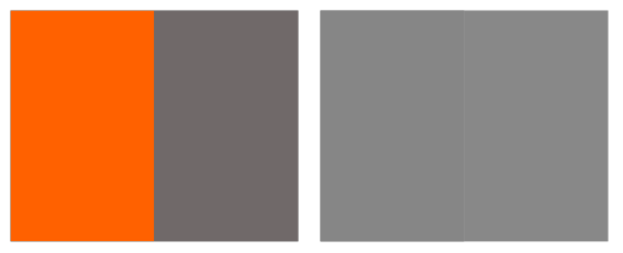 왼쪽의 주황/회색의 대비는 매우 극명해보이지만, 동일한 색상칩을 명도로만 구분하게된다면 오른쪽처럼 거의 차이가 없이 나타납니다.